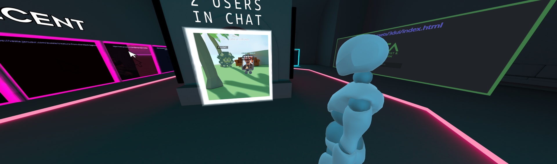 Through JanusVR, websites become 3D spaces interconnected by portals. Users navigate, explore, collaborate and create content through a combination of traditional keyboard-and-mouse input, controllers, voice and gestures.
